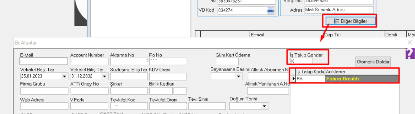 Diğer Bilgiler Ekranından İş Takip Gönder kutucuğuna '' X '' tanımlanmalı ve Mail olarak gidecek iş takip kodu seçilmelidir.