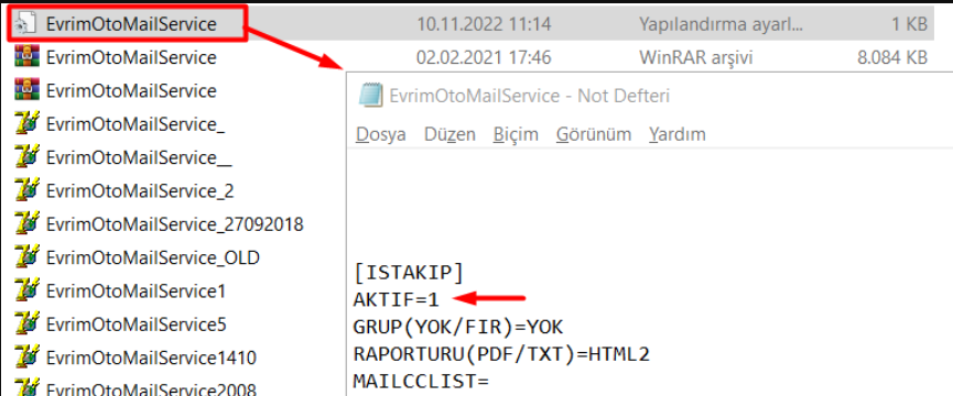 EvrimOtoMailService Servisinin kurulu olduğu bilgisayardan kurulmuş olduğu dosya açılıp EvrimOtoMailService yapılandırma ayarları dosyasına giriş yapılarak Görseldeki [ISTAKIP] alanı Dosyalardaki anlık iş takip gönderimi için '' 1 '' yapılır.