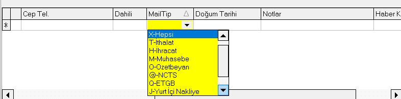 Not :Müşteri girişi ekranındaki Mail Tip alanındaki Tiplerinin açıklaması aşağıda yer almaktadır. Yukarıdaki Örneğimizde M-Muhasebe tipini seçmemizin sebebi FA fatura kesildiğinde atılan bir iş takip kodu olması ve karşı firmada muhasebe ilgilisini ilgilendiren bir konu olması sebebi ile M-Muhasebe seçilmiştir. İlgililer alanında hangi MailTip bilgisi seçildiyse seçilen Tip ile alakalı iş takiplerin mailleri ilgiliye gidecektir. X seçilirse İthalat-İhracat dosyalarıyla ilgili iş takip kodu gidecektir. M tipi seçilirse Muhasebe sistemiyle ilgili iş takip kodları gidecektir.
