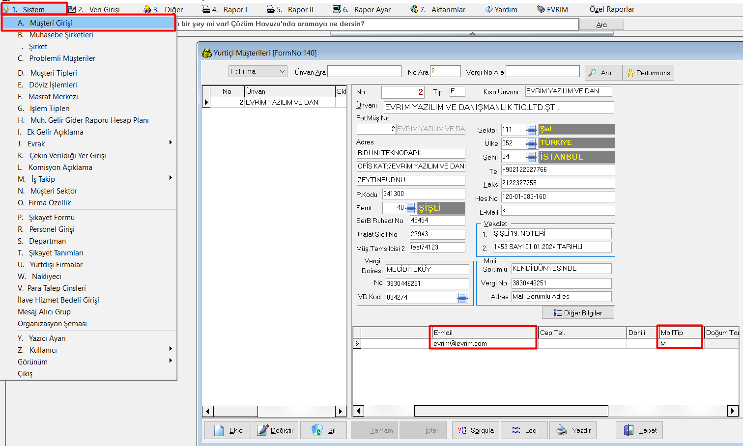 Muhasebe > 1.Sistem > A. Müşteri Girişi > Ekranında ilgili müşteri seçilip İlgililer alanında firmada mail gidecek olan ilgilinin mail adresi tanımlanmalı ve MailTip Alanında uygun Tip Seçilmelidir.