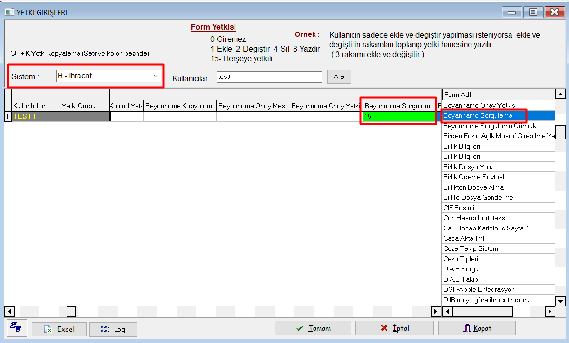 Admin şifresi ile Users/ Sistem/Çoklu yetki girişi/İthalat başlığı altında /Sorgulama Beyanname alanına 15 verilmelidir. Admin şifresi ile Users/ Sistem/Çoklu yetki girişi/İhracat başlığı altında /Beyanname Sorgulama alanına 15 verilmelidir. -Yetki ...