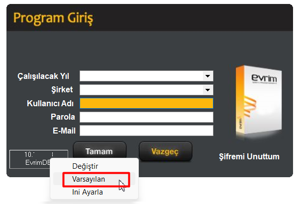 1. Program giriş ekranında ekran sol alt kısmında server bilgisi yazılan alana sağ tıkanılıp Varsayılan butonuna tıklanır.