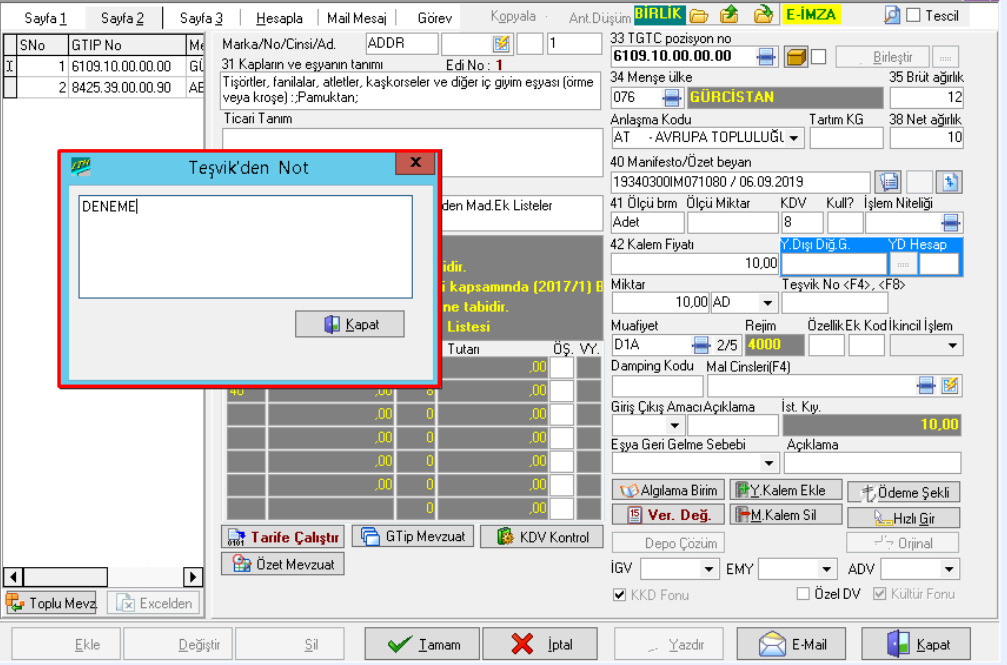 İthalat Beyannamesi / 2. Veri girişi / K. Teşvik ekranında Açıklama alanına bir not yazıldığı takdirde beyanname kalemlerinde not girilmiş olan teşviği seçtiğinizde ekrana Teşvik Notu olarak gelecektir.