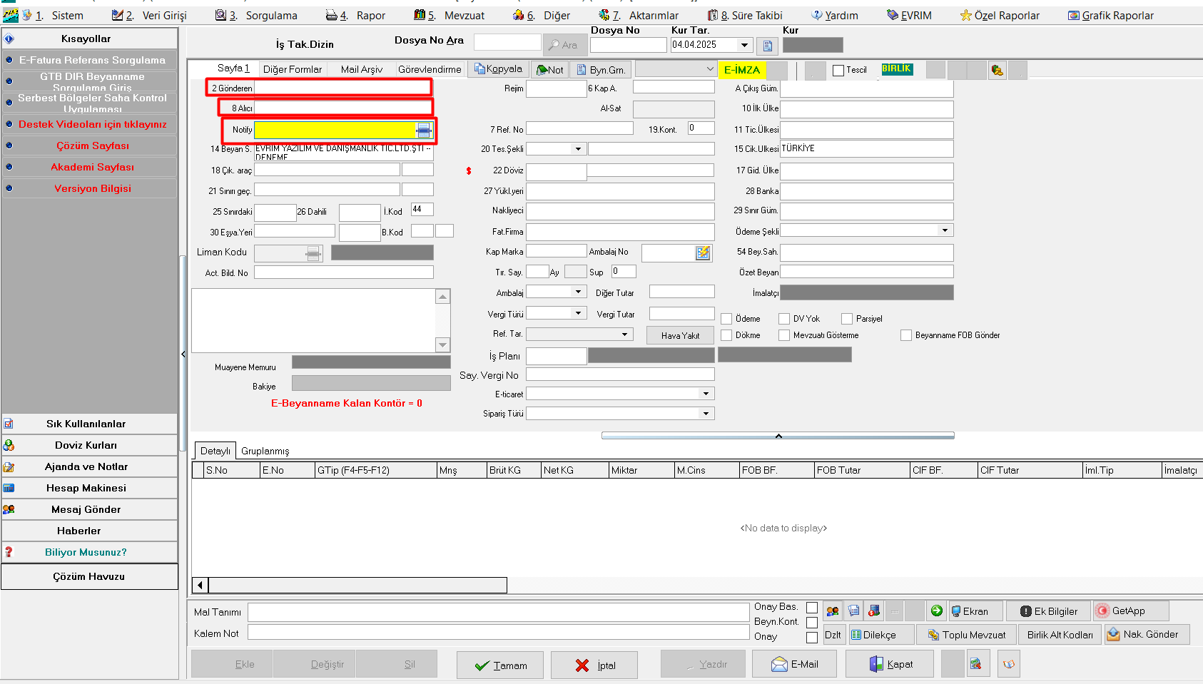 Boş olan alanları doldurduktan sonra beyannamenizin üzerinden firmalarınızı ( İthalatçı ve İhracatçı firmalarınız ) yeniden seçip, tamam dedikten sonra, faturalarınızı yeniden gönderebilirsiniz, işlem başarılı olacaktır.