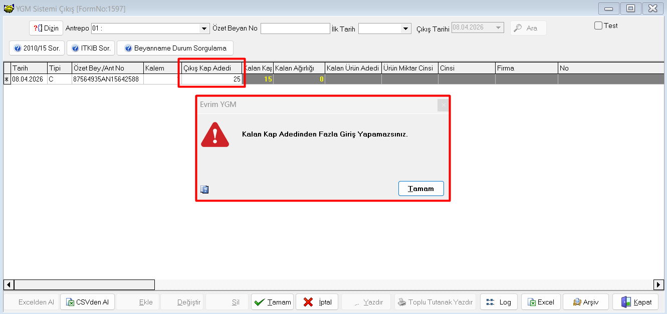 Örneğin, aşağıdaki durumda Giriş ekranında kap adedi 15 olarak görünmesine rağmen, Çıkış ekranında çıkış kap adedi 25 olarak girildiğinde “kalan kap adedinden fazla giriş yapamazsınız” hatası alınmaktadır.