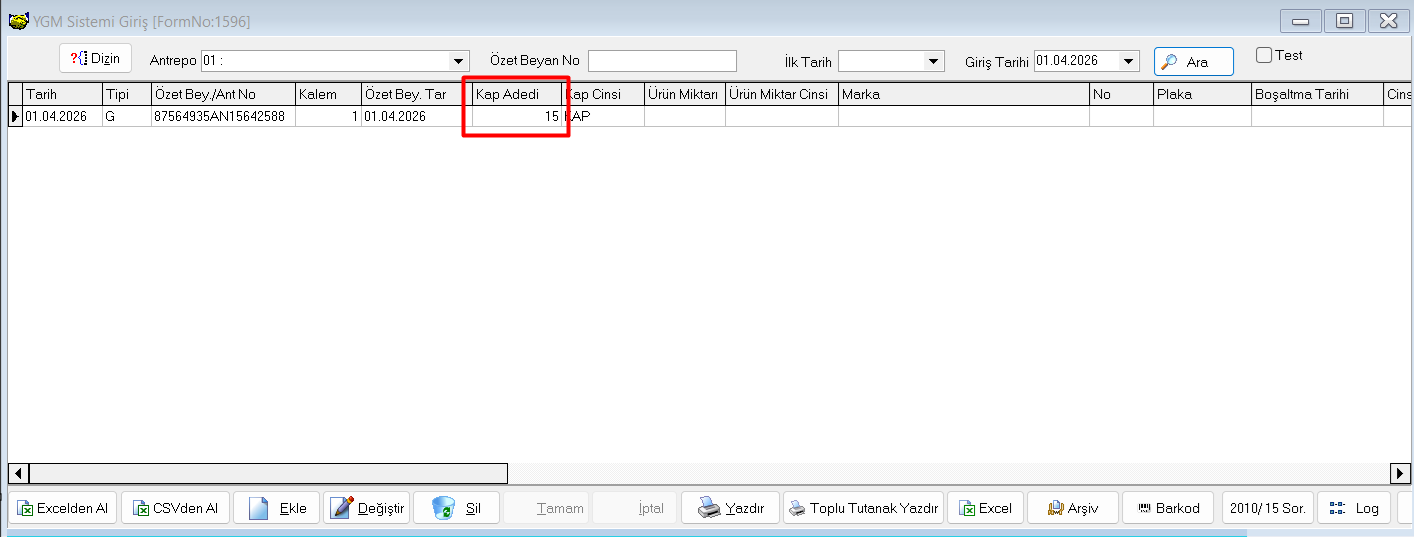 2. Veri Girişi > A. Çıkış ekranında ilgili özet beyan kaydına girilen kap adedi kontrol edilmelidir.