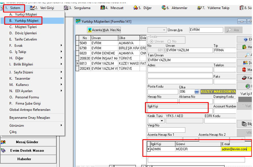 1. Sistem / B. Yurtdışı Müşteri ekranından Değiştir denilerek ilgili kişi alanlarına mail bilgileri yazılabilir. Alt satır açılarak birden fazla ekleme yapılabilir.